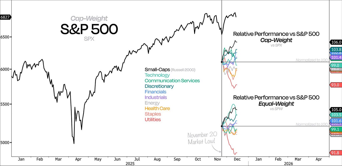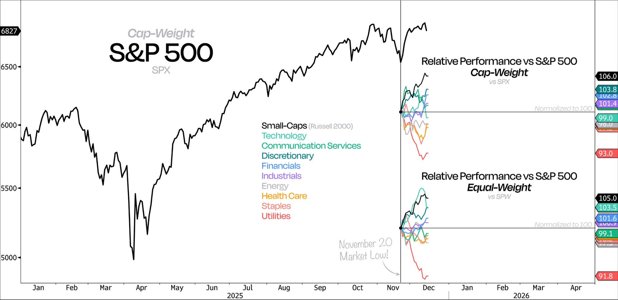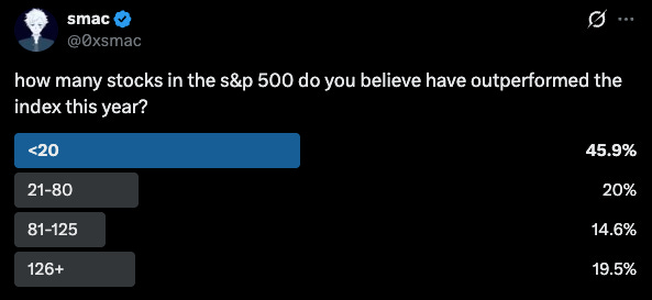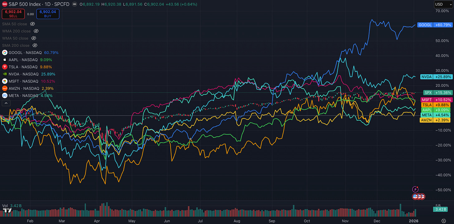Another related fact: only 2 of the mag 7 names outperformed the underlying index in 2025. So the narrative that only 7 names are propping up returns and the market as a whole continues to be debunked (more on this later).