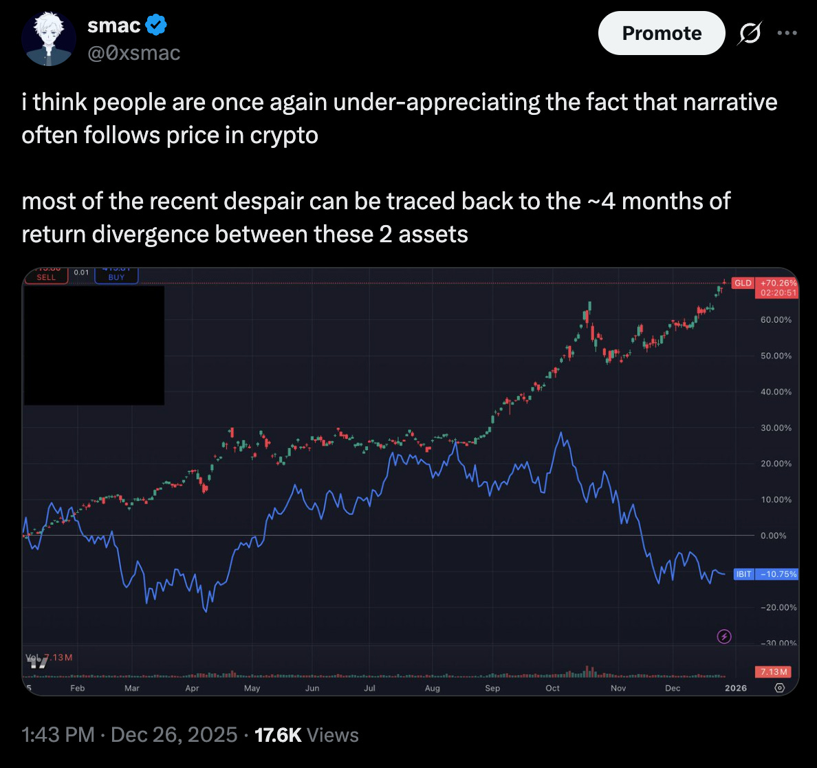 Last year we saw the President launch a memecoin so it’s hard to imagine we’ll see something more outrageous in 2026. I think plur_daddy did a nice job laying out the retrospective for crypto underperformance in 2025 so I suggest you read his words on it. But also, in my opinion the majority of the negative sentiment around crypto can be attributed to this…