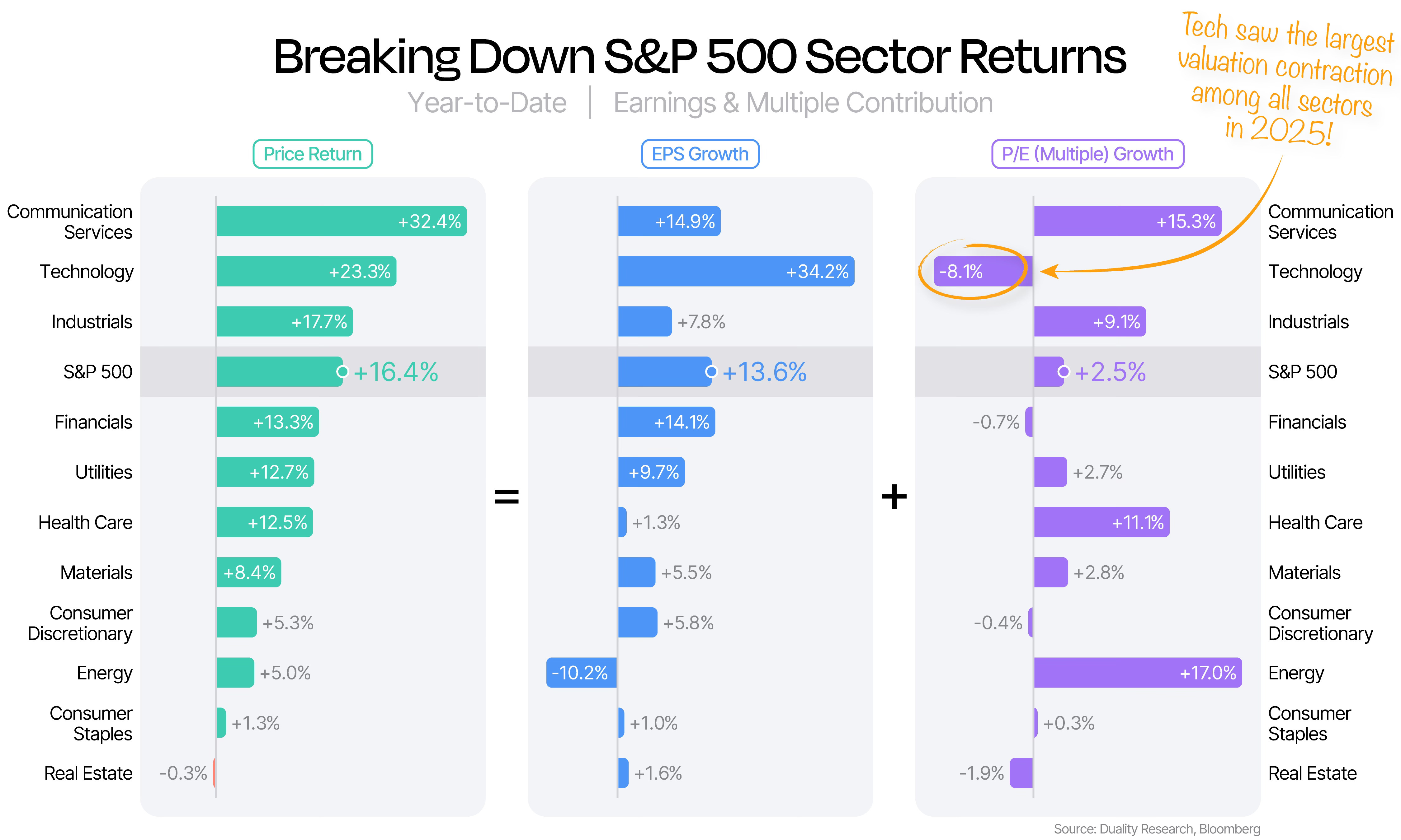 It’s also worth noting that with the exception of Oracle (who doesn’t have the cards), the companies fueling this are the greatest companies that have ever existed. I think something most investors are probably unaware of, is that the technology sector actually had the largest P/E multiple contraction of any sector in 2025.