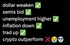 If you made me choose today, I’d say I expect to see the dollar weaken, the bid for semis to return, unemployment to trend higher with inflation coming down, traditional equities end the year higher17 and crypto will outperform once again.