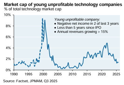 Today, the consensus on the Street is for ~14% EPS growth. Now for as much as you want to rip on these strategists (and I do this as well), they are quite good at forecasting aggregate earnings9. This is the fundamental part of the job. What’s also maybe illuminating is that despite what we hear about unprofitable tech companies, the equity market is less reliant on these types of companies than it was in previous eras. Look at how exorbitant these were during the dot-com bubble and even during the SPAC boom in 2021.