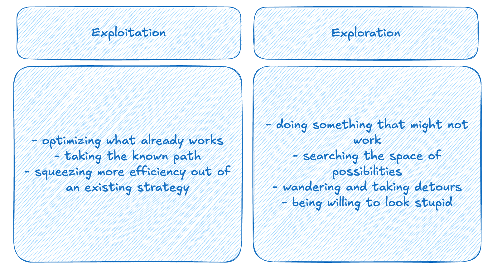 A system that only exploits becomes very good at a narrow thing and then gets stuck. A system that explores creates the possibility of discovering something better, something stranger or even something that rewrites what better even means altogether.