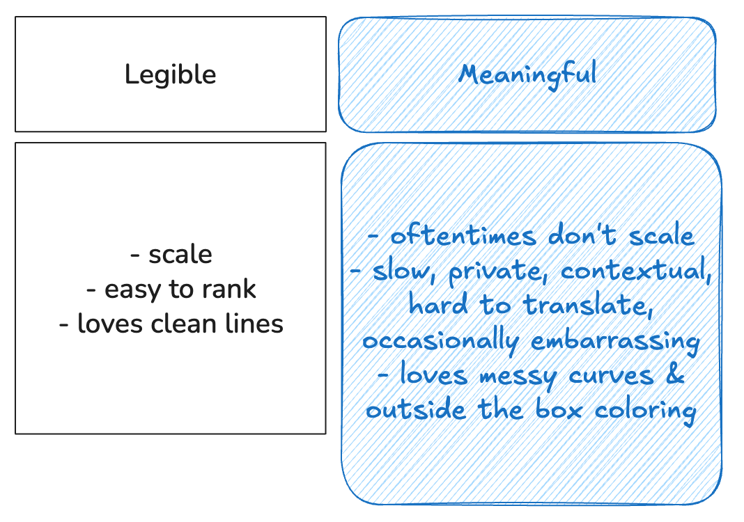 If you build a society that worships at the legibility altar then you eventually find yourself surrounded by people and products that are easily understood but impossible to love or that don’t evoke any kind of emotion.