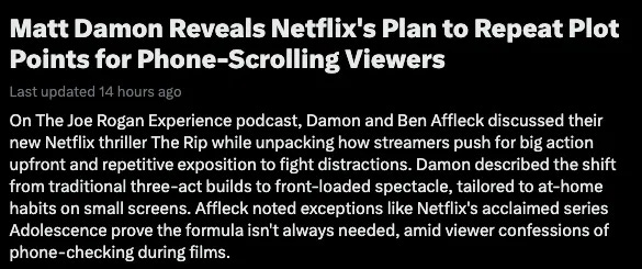 But the economics and distribution changed and all of a sudden the entire supply chain was optimized. Franchises and sequels are now safer (there’s that word again) than originals. I included the movie The Rip specifically because even Matt Damon recently admitted – WHILE HE WAS PROMOTING THE MOVIE – that films are becoming shittier because audiences need to be bashed over the head with plot points. This is literally the definition of stripping away nuance.