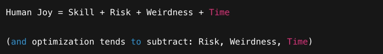 Everything is not ruined. But everything is converging. The range of possible experiences is shrinking toward a future of whatever is most efficient, most legible, most repeatable, most monetizable in the moment. It can still be fun of course. And many people are doing well and enjoying this world. It’s kind of weird because optimization obviously shouldn’t really feel like a villain.